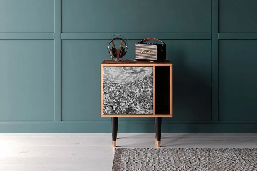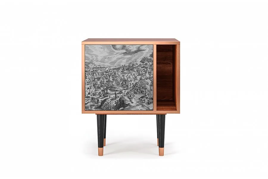 Прикроватная тумба для спальни или стильный элемент для любого другого помещения. Материалы: корпус ЛДСП (орех, серый, антрацит, латте, сатин, белый) фасады МДФ с UV печатью. Дверки оснащены доводчиками и открываются от нажатия. Нога бук с медным наконечником.